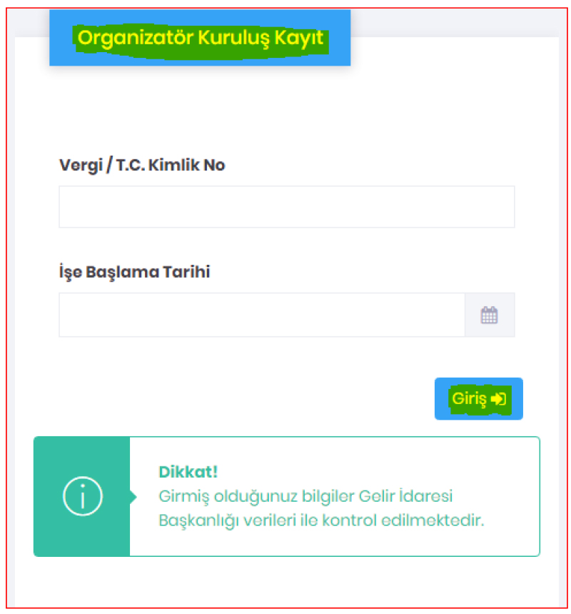 3- Gelen ekranda kuruluşunuzun Vergi Levhasında belirtilen “İşe Başlama Tarihi” ni girdikten sonra, Vergi numarasını da girmek suretiyle “Giriş” Butonuna tıklayınız,