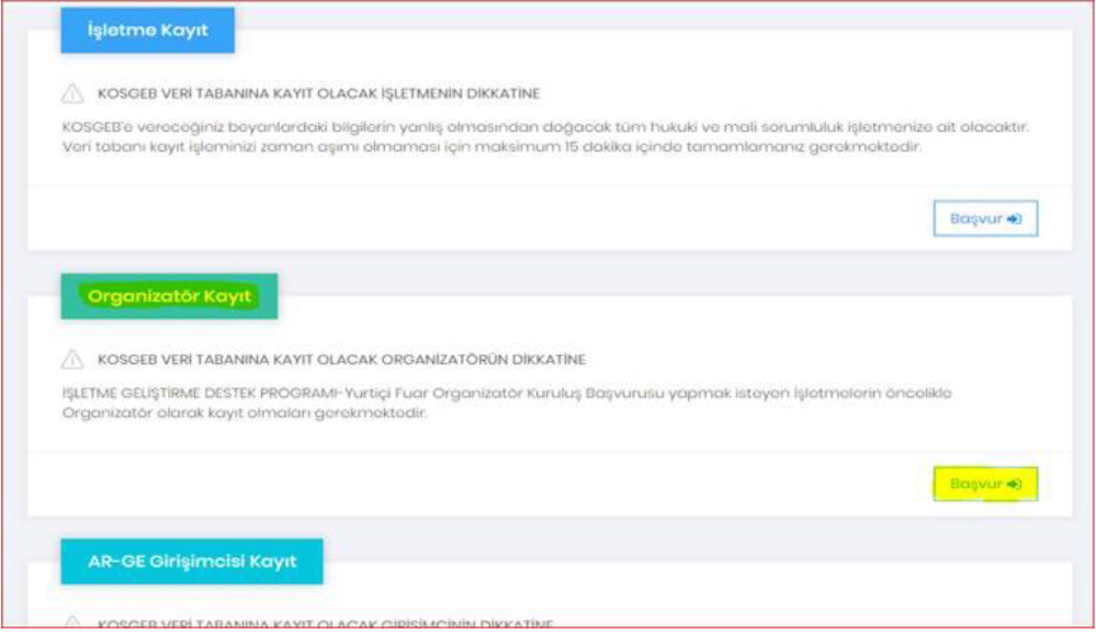 2- Organizatör Kayıt Bölümünün hemen altındaki “Başvur” butonuna tıklayınız,